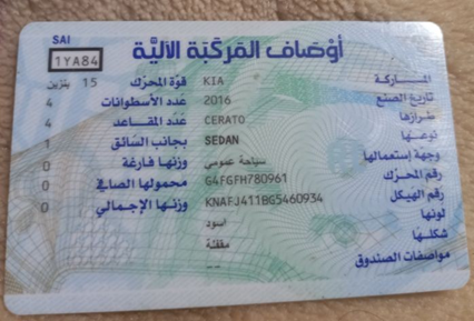 Certificate Of Vehicle Registration front & Back Side - اﻟﺧﻠف و اﻷﻣﺎم ﻣن اﻟﻣرﻛﺑﺔ رﺧﺻﺔ