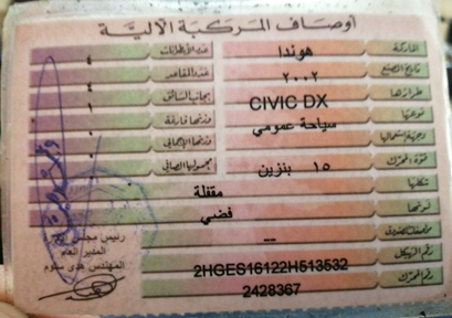 Certificate Of Vehicle Registration - ﻧﺎرﯾﺔ ﺑدراﺟﺔ ﺧﺎﺻﺔ اﻷﻣﺎم ﻣن اﻟﻣرﻛﺑﺔ رﺧﺻﺔ